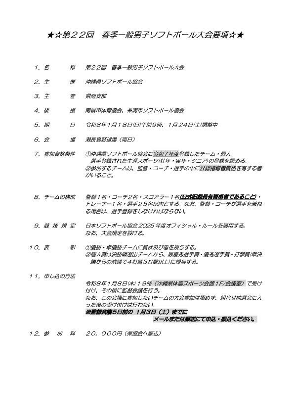 【一般男子】第22回春季一般男子ソフトボール大会 大会要項