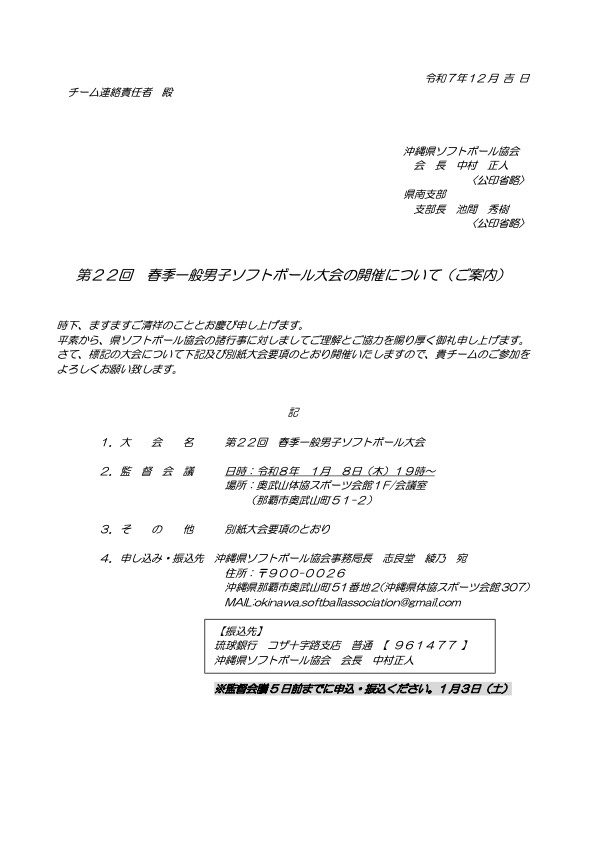 申込先メールアドレス:okinawa.softballassociation@gmail.com