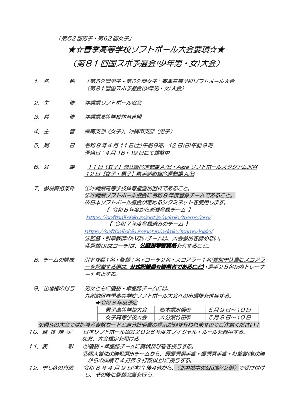 【訂正版】第52回男子・第62回女子春季高等学校ソフトボール大会 大会要項