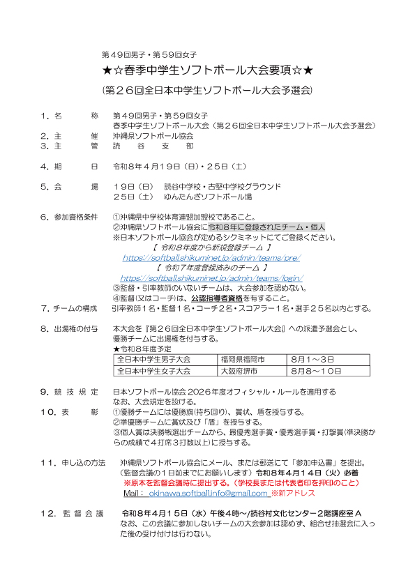 第49回男子・第59回女子春季中学生ソフトボール大会(第26回全日本中学生ソフトボール大会予選会)が開催されます。