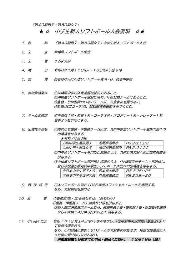 【中学校】第49回男子、第59回女子中学生新人ソフトボール大会 大会要項