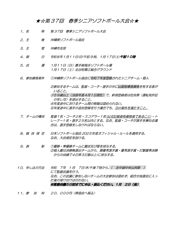 【シニア】第37回春季シニアソフトボール大会 大会要項
