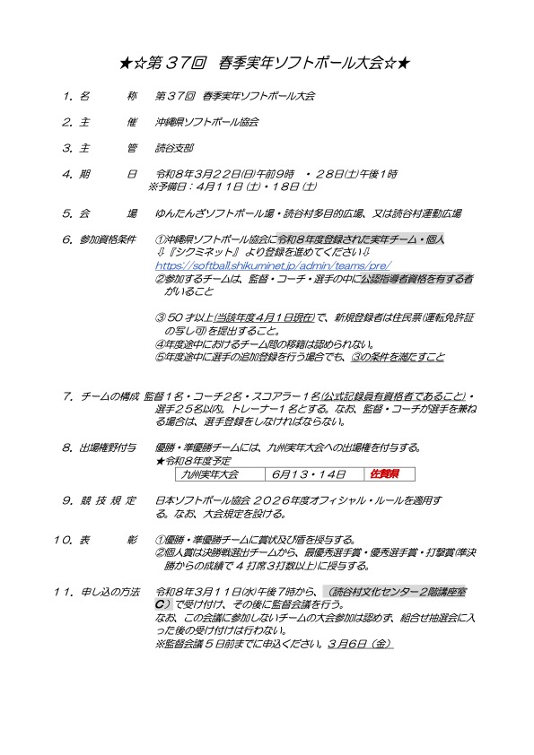 大会要項:【実年】第37回春季実年ソフトボール大会 大会要項