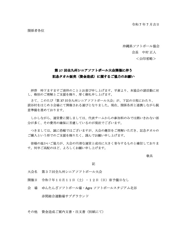 PDF:【ご協力依頼】第37回全九州シニア大会開催に伴う記念品タオル販売(資金造成)に関するご協力のお願い