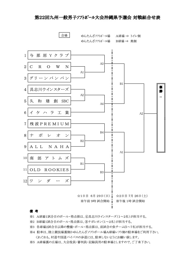 【一般男子】第22回九州一般男子ソフトボール大会沖縄県予選会 組み合わせ表
