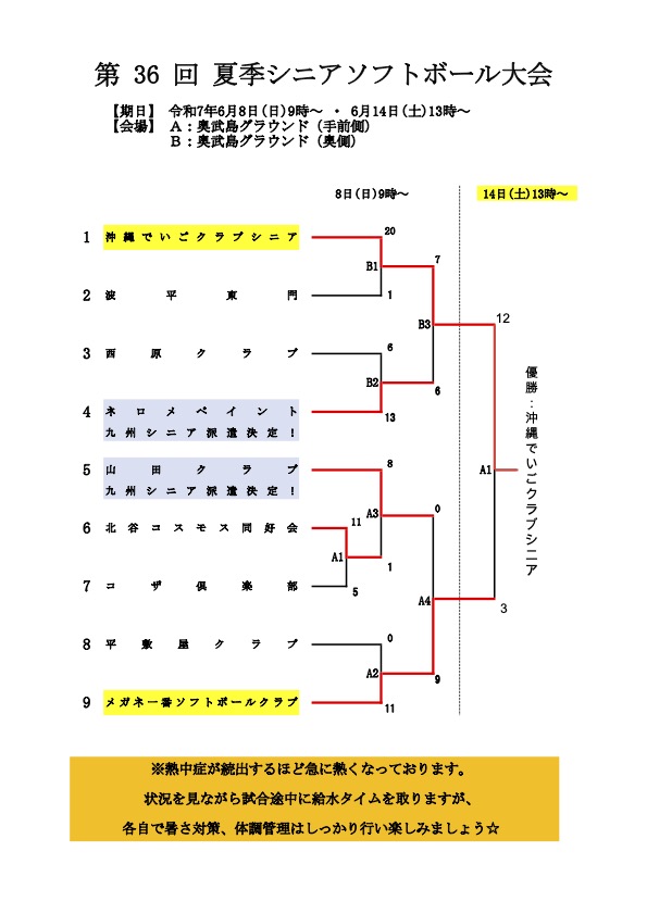 令和7年6月8日(日)にて開催された第36回夏季シニアソフトボール大会の最終結果です!優勝された「沖縄でいごクラブシニア」は10月4日(土)〜7日(火)にて福岡県で開催される「全日本シニア大会」へ派遣されます!