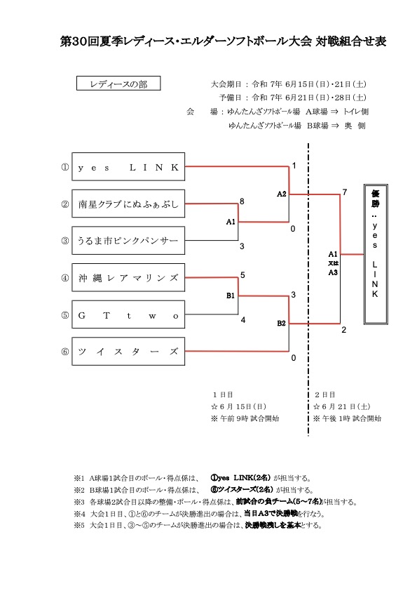 令和7年6月15日(日)にて開催された第30回夏季レディース・エルダーソフトボール大会の最終結果です!優勝された「yes LINK」は9月6日〜8日にて岩手県花巻市で開催される【全日本レディース大会】へ派遣されます!